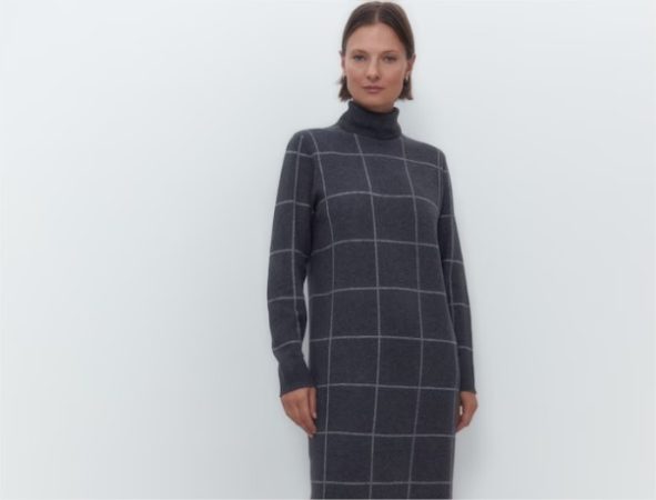 El encanto atemporal se une a la calidez en este vestido de punto en un suave tono gris claro. Su cuello vuelto te mantendrá abrigada y elegante en los días más frescos.