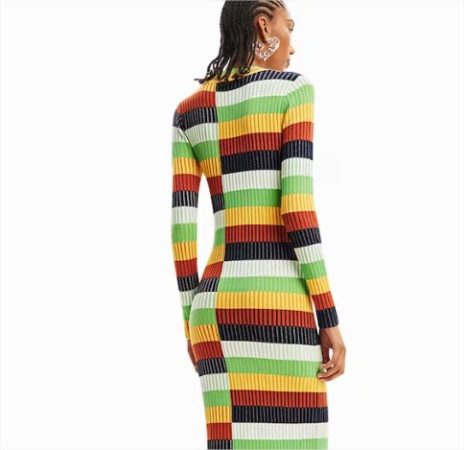 El vestido de punto midi a rayas es una pieza que destaca por su versatilidad y su vibrante paleta de colores. Su diseño a rayas, que combina tonalidades audaces, aporta un toque moderno y juvenil a cualquier atuendo. La longitud midi y el corte cómodo lo hacen perfecto para todo tipo de ocasiones, desde un día en la oficina hasta un paseo por la ciudad.