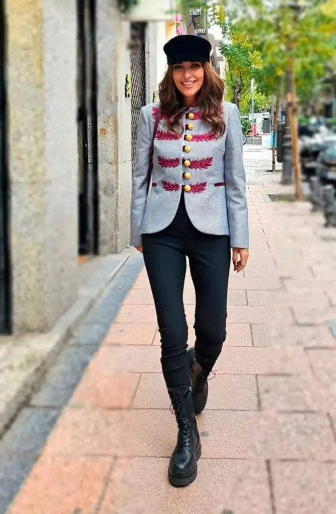 En un reciente estilismo que ha acaparado todas las miradas, Paula combinó sus botas militares con una americana entallada, destacando un estampado de pata de gallo, botones dorados y detalles en un tono burdeos. Completando el conjunto con unos leggings ajustados de Zara y una sofisticada gorra negra, la actriz logró un look que destila elegancia.