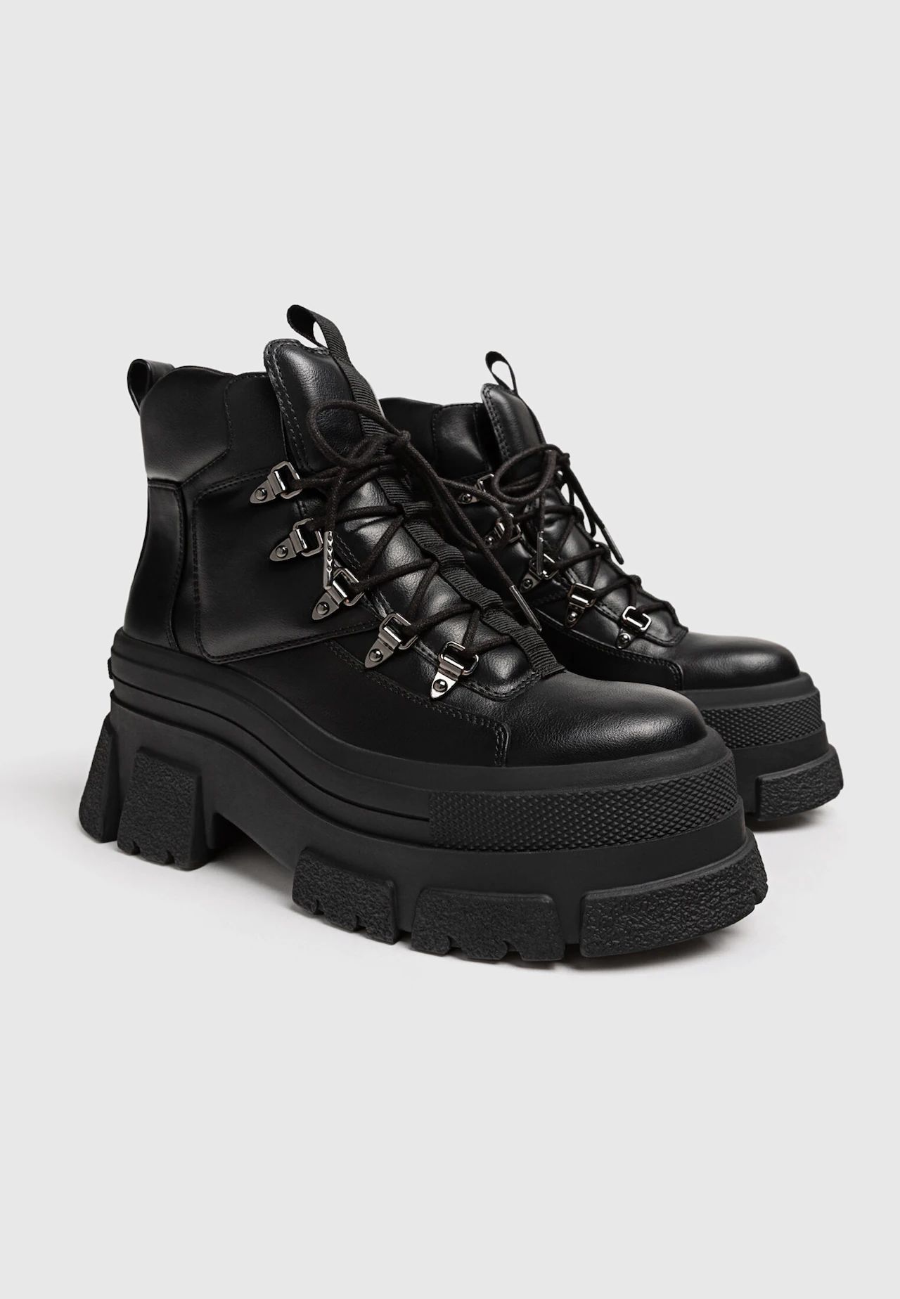 La última tendencia en calzado de Stradivarius con estos fascinantes botines flatform estilo montaña para mujer, disponibles en un atractivo color negro. Con un toque distintivo gracias al detalle del tirador en la parte trasera, estos botines no solo aportan estilo, sino también comodidad. El cierre mediante cordones garantiza un ajuste perfecto, mientras que la suela tipo flatform, con una altura del piso de 9,3 cm, eleva tu look a nuevas alturas.