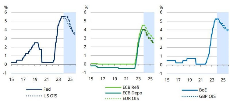 De hecho, hemos retrasado nuestras expectativas y ahora esperamos un primer recorte de tipos de interés por parte de la Fed en septiembre de 2024, con una caída de los tipos de 200 puntos básicos hasta el 3,5% en 2025, un poco más tarde de lo que el mercado descuenta actualmente”.