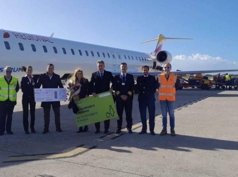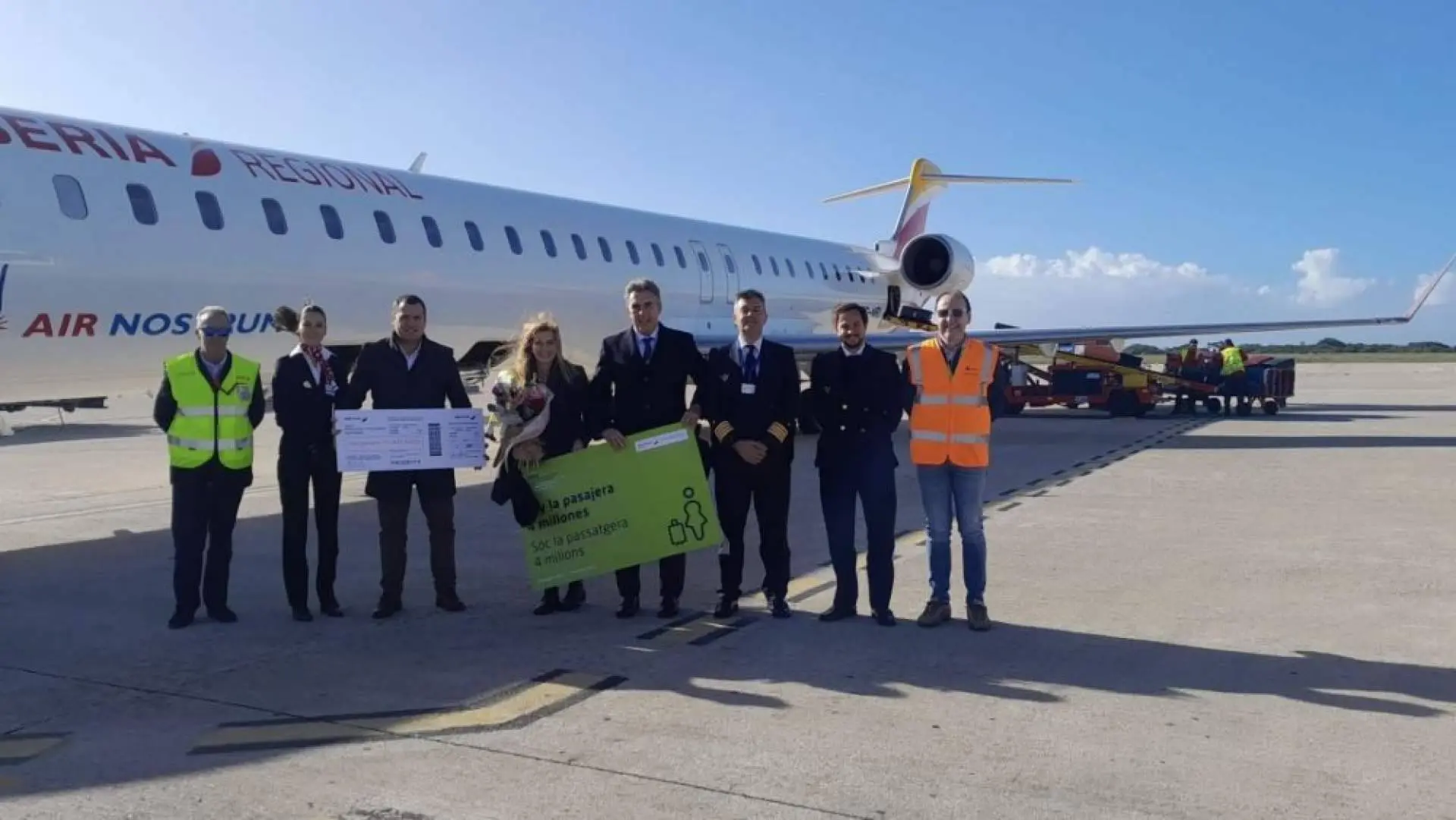 El Aeropuerto de Menorca celebró el 14 de diciembre su pasajero 4 millones por primera vez en toda su historia. Para conmemorarlo, el director del aeropuerto, Santiago Martínez-Cava y el jefe de escala de Iberia, Amancio Fernández, han felicitado a la pasajera que embarcaba en el vuelo de las 13:45h con destino Madrid y le han obsequiado con un ramo de flores, unos pases para la sala Vip del Aeropuerto y un cheque con 35.000 Avios, canjeables por billetes de avión, regalo de la aerolínea.