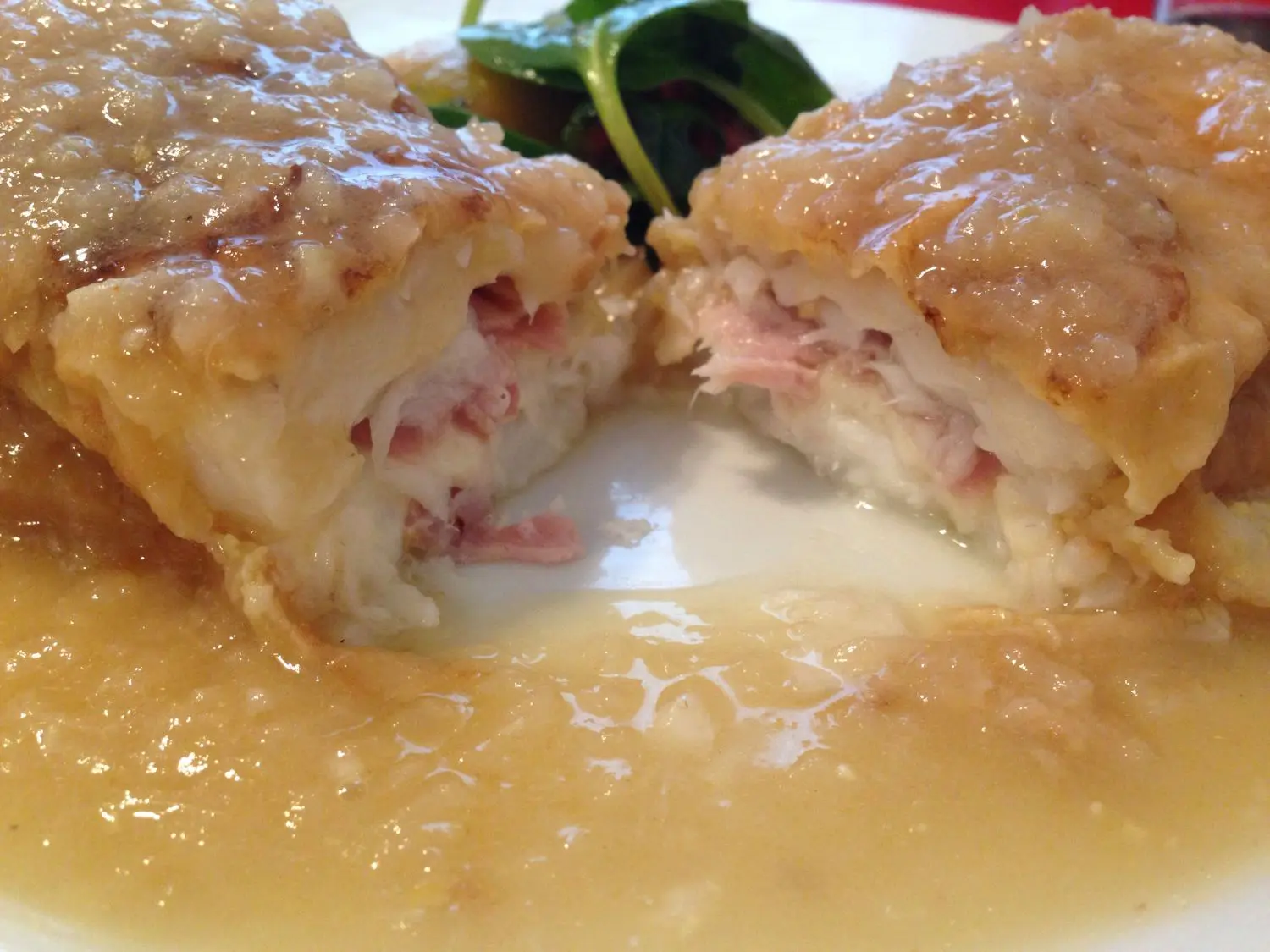 - Sirve el cachopo sobre una cama de salsa verde, hecha con perejil, ajo, aceite y un toque de vinagre.