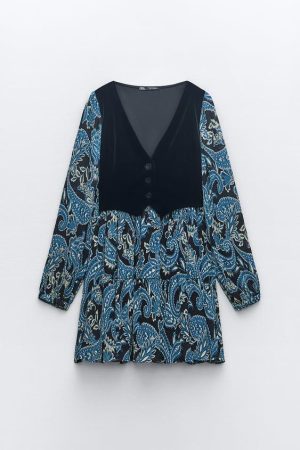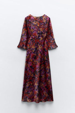 - Vestido Zara: de Flores El estampado de flores sobre tejido satinado en colores rojo, amarillo y morado define este vestido de cuello redondo y manga por debajo del codo. Con detalles como el cierre lateral con cremallera oculta y abertura en la espalda, su precio es de 39,95 euros.