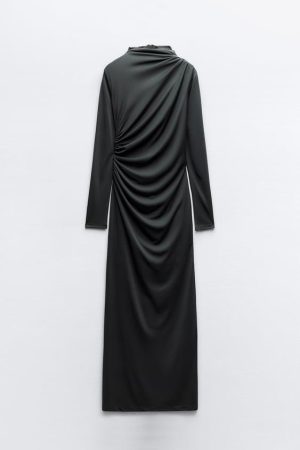 - Vestido Zara: Drapeado Este vestido confeccionado en tejido de punto, cuello subido y manga larga destaca por su detalle tejido drapeado. Con un forro interior combinado, abertura en la espalda y cierre con cremallera oculta, este modelo se presenta como una opción elegante por solo 29,95 euros.