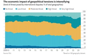 Los datos de la Unidad de Inteligencia de The Economist muestran un fuerte aumento de la amenaza que suponen las tensiones internacionales en los últimos 15 años. En 2009, alrededor del 40% de las zonas geográficas se enfrentaban a una amenaza «nula» o «baja» por conflictos internacionales; en la actualidad, esa proporción se aproxima al 20%.