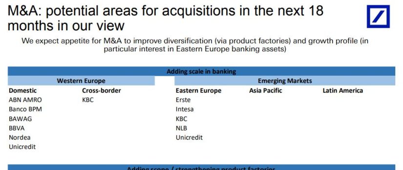 En el documento, Deutsche Bank incluye, de cara a compras en lo que llama Europa Occidental a ABN AMRo, KBC Erste, Banco BPM Intesa, BAWAG, KBC, NLB y Nordea. Estas entidades, según Deutsche, son las que pueden ser potenciales compradores durante los próximos 18 meses.