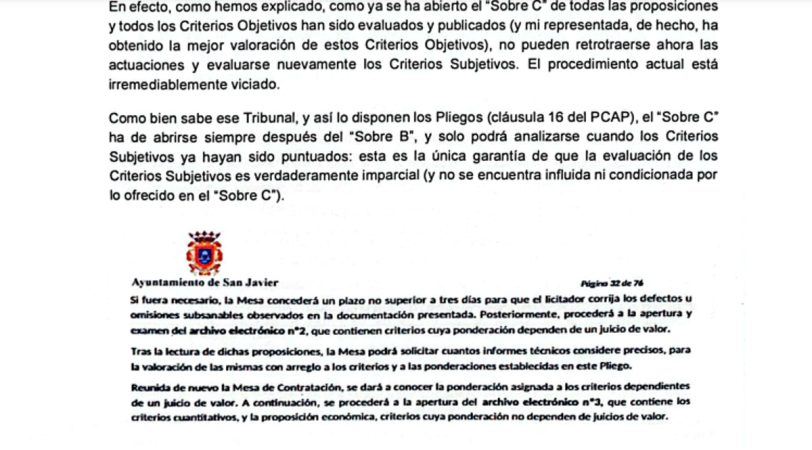 El escándalo de San Javier saltó a la palestra a principios de mayo, justo antes de las elecciones autonómicas y municipales. El equipo municipal tenía prisa por atar el concurso antes de los comicios, pero no se esperaba la respuesta empresarial. Por norma, las empresas que pierden suelen dejar las cosas como están, sin meterse en el embrollo judicial. No obstante, las empresas ofertantes que no pasaron el corte no se dieron por vencidas. La primera dio en el clavo, la segunda llegó tarde ante el requerimiento de la primera.