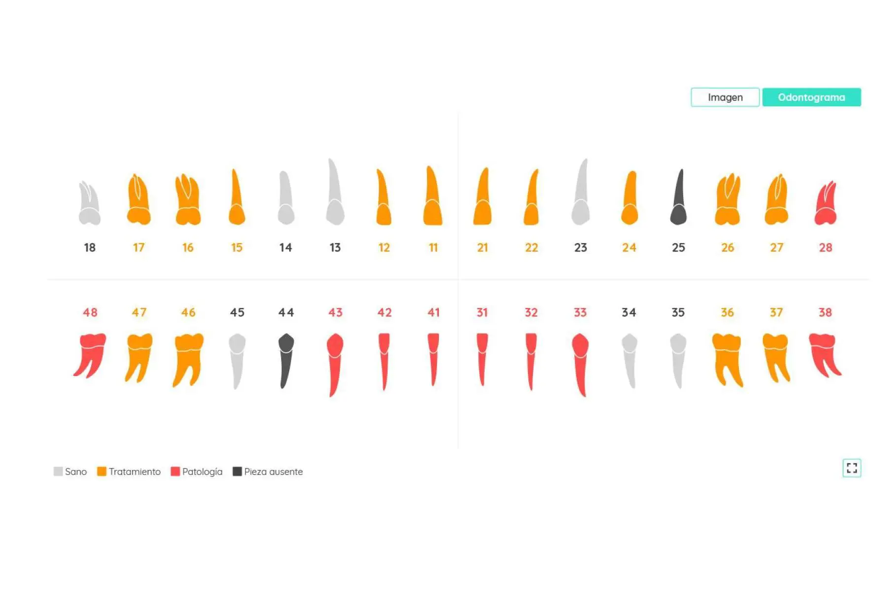 En este apartado, se puede generar una visión radiográfica ampliada, sin los detalles descriptivos que ofrece el software, para una mejor observación. La segunda forma es el odontograma, una representación pictográfica de las piezas dentales. En ambos casos, el usuario puede navegar a discreción por cada uno de los dientes para su estudio y observación.