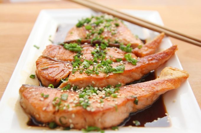 Marina el salmón, colócalo sobre obleas con aguacate y menta, cierra y cocina. Prepara una salsa con soja, ajo, cebollino y sésamo.