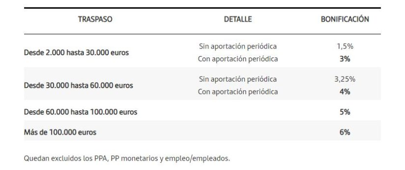 El porcentaje de la bonificación dependerá del importe traspasado y la aportación periódica establecida. Esta promoción estará vigente hasta el 31 de enero de 2024.
