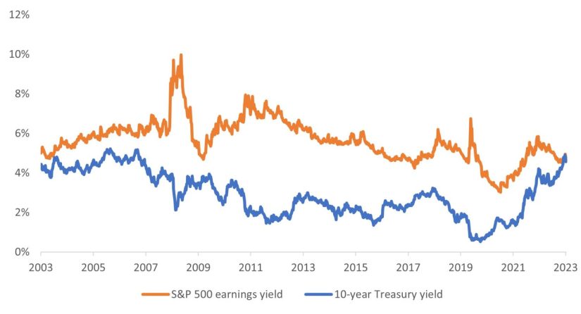 Exhibit 1: S&P 500 earnings yield vs. 10-year Treasury yield (2003 – 2023)