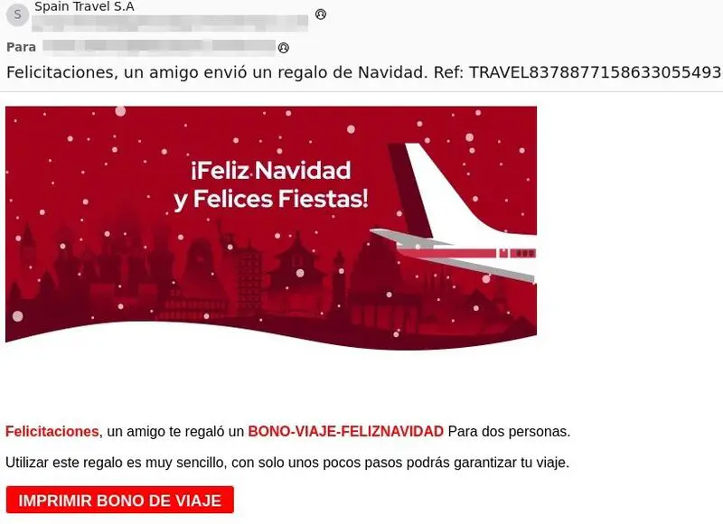 En el mensaje del correo, se nos felicita informándonos de que un amigo nos envió un regalo de navidad en forma de un bono de viaje el cual debemos imprimir. Para ello, nos proponen hacerlo a través de un enlace que nos descarga un archivo.zip, pero en realidad es un archivo .msi, es decir, es un archivo ejecutable que contiene un código malicioso.