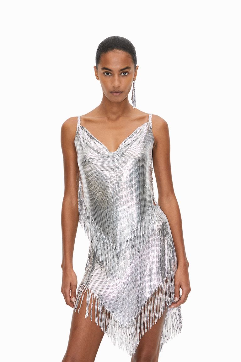 El top desflecado en malla de metal de la colección Rabanne H&M se erige como una opción elegante y vanguardista. Este elegante top, confeccionado en la icónica malla de metal del diseñador, presenta un diseño vanguardista y atrevido perfecto para destacar en cualquier evento festivo.