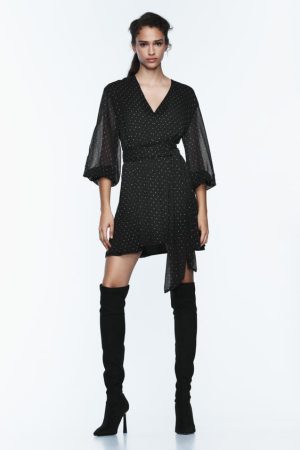 Las mangas ligeramente abullonadas y semitransparentes añaden un elemento festivo y chic al vestido. Adornadas con discretos cristales, estas mangas transforman la pieza en un ícono de moda para eventos nocturnos. Se trata de una prenda que podemos vestir tanto para ocasiones informales, combinado con zapatillas deportivas retro; como para veladas elegantes, emparejado con botas altas o tacones.