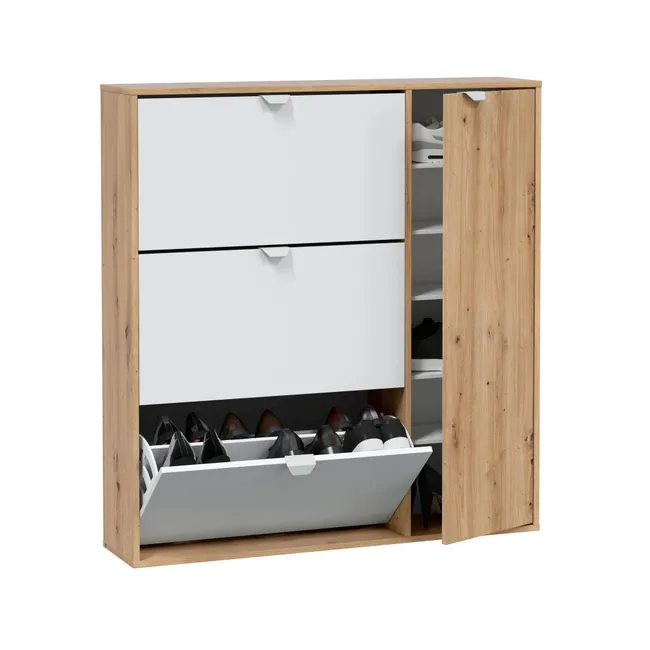 Este zapatero blanco con detalles en roble natural, de dimensiones 105x112x24 cm, es perfecto para quienes anhelan llegar a casa y liberarse de sus zapatos. Con capacidad para almacenar hasta 30 pares, no solo es práctico sino también estéticamente agradable. Además de su función principal, cuenta con un armario que incluye estantes y una puerta para mantener tus objetos personales fuera de la vista.