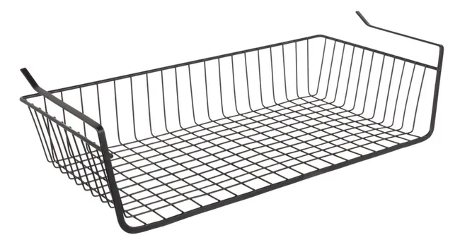 Optimiza tu espacio con esta cesta colgante de metal en negro, generosa en dimensiones con 56x14x26 cm (ancho x alto x fondo). Perfecta para maximizar el almacenamiento dentro de armarios, esta cesta grande se sujeta fácilmente a cualquier balda o estantería gracias a sus dos brazos, sin necesidad de tornillos. Ideal para armarios roperos, cocinas, aseos, y más.