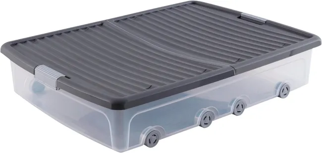 Optimiza tu espacio con la bajocama de la colección SPACEO con ruedas, de dimensiones 16.5x79x58 cm y una generosa capacidad de 55 litros. Perfecta para almacenar mantas o ropa de otras temporadas sin ocupar espacio adicional. Equipada con ruedas para deslizarse fácilmente bajo la cama, esta solución de almacenamiento ofrece un alto nivel de transparencia para identificar su contenido sin abrirlo.