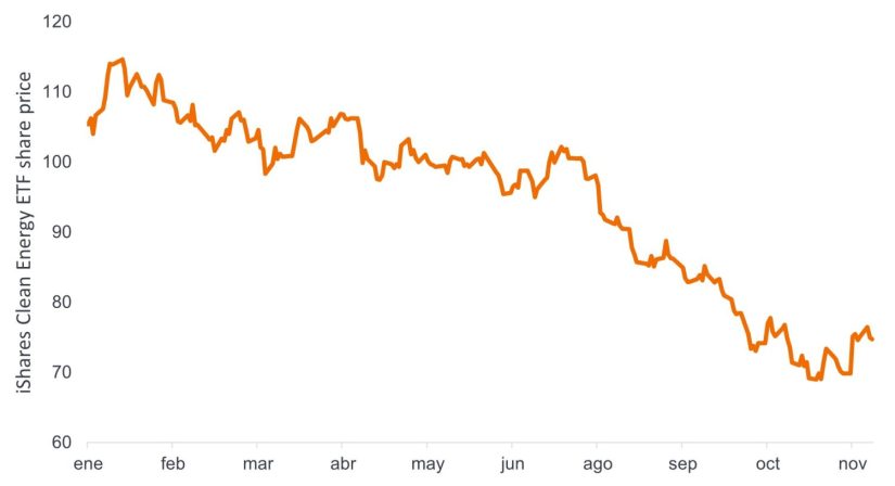 Source: iShares Global Clean Energy ETF, 3 January 2023 to 22 November 2023. Rebased to 100 at beginning of period. Past performance does not predict future returns.