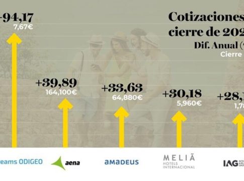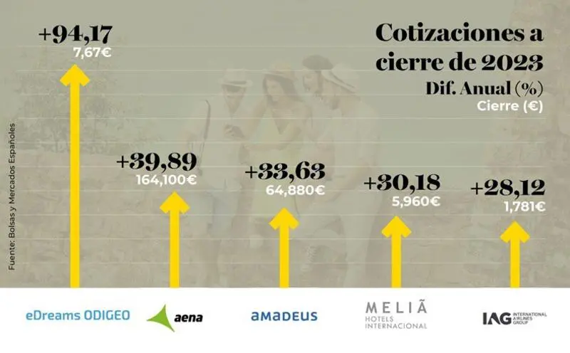 Esta recuperación se trasladó en 2023 al mercado bursátil, así en el ejercicio completo, Meliá Hotels International avanzó un 30,18%, casi lo mismo que International Airlines Group (IAG) que se anotó un 28,12%. También obtuvieron resultados muy positivos otras empresas dependientes del turismo como Amadeus, con un 33,63%, o el gestor aeroportuario Aena, que repunta un 39,89%.