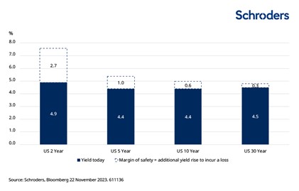 Y no es sólo importante el nivel de rendimiento, también lo es el nivel de protección que el cupón (o renta) más alto proporciona a los inversores. La rentabilidad de la deuda soberana se compone de dos elementos -precio e ingresos-, por lo que un nivel más alto de ingresos constantes significa que se puede estar expuesto a una mayor depreciación de los precios antes de experimentar pérdidas en la rentabilidad total.
