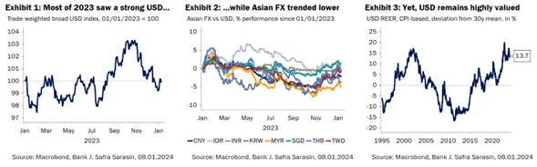 Al contrario de lo esperado, el dólar estadounidense se mantuvo fuerte durante gran parte del pasado año (Gráfico 1), mientras que la mayoría de las divisas asiáticas cedieron gradualmente los beneficios obtenidos gracias a la reapertura de China a principios de 2023 (Gráfico 2). Tras el giro de la Fed en su reunión de diciembre, las divisas asiáticas emprendieron una senda de recuperación, pero la mayoría de ellas siguen bajo mínimos y el dólar sigue estando muy valorado en términos históricos (Gráfico 3).