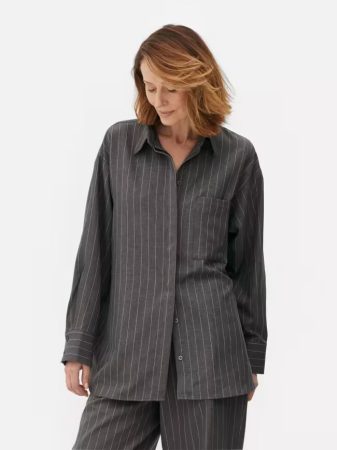 Entre las joyas de la colección, destaca un conjunto con estampado de raya diplomática, una elección acertada que sigue de cerca las tendencias de la temporada. Con una silueta oversize, este total look se presenta como una opción ideal para aquellas mujeres que buscan comodidad sin sacrificar el estilo, tanto dentro como fuera de la oficina.