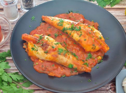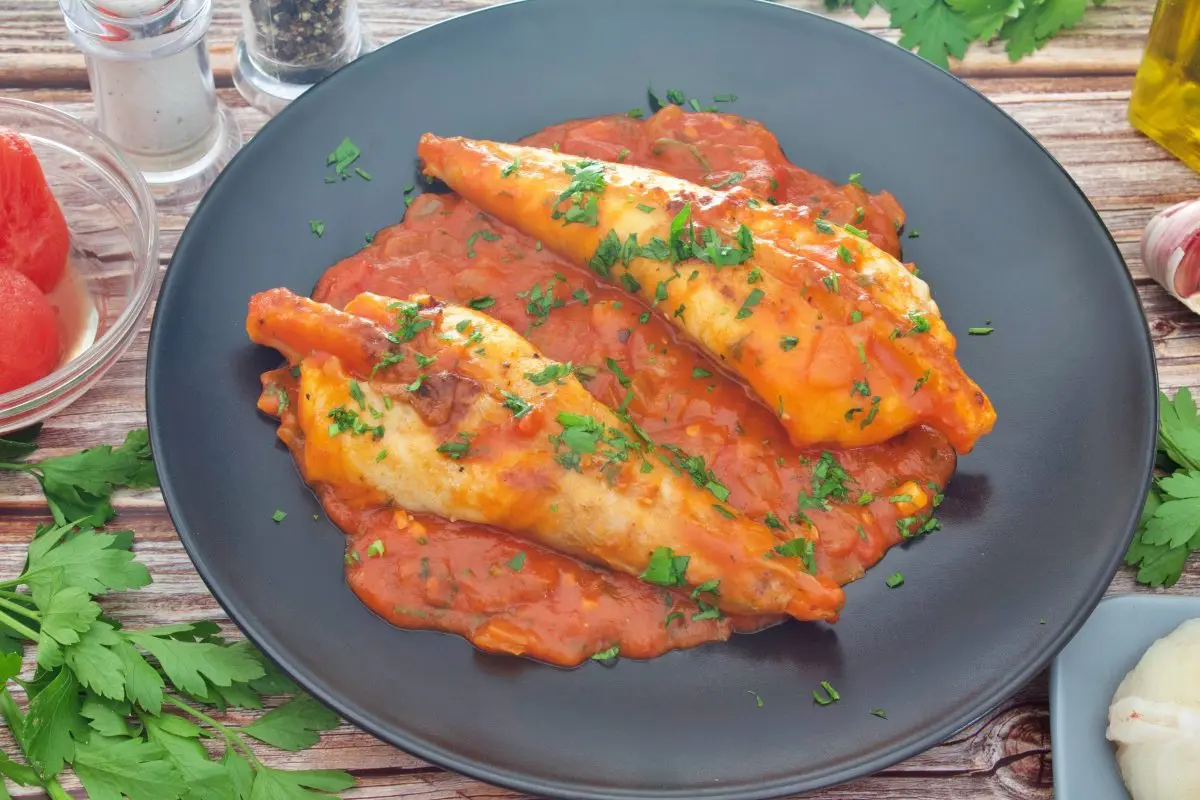 - Servir y Decorar: Sirve los filetes de rape en platos individuales, cubriéndolos generosamente con la salsa de tomate. Decora con perejil fresco picado para un toque final.