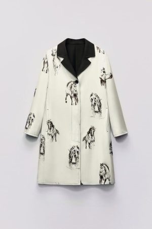 Para aquellos que buscan una opción más creativa, el abrigo con estampado de caballos es una elección única. Confeccionado en hilatura de viscosa al 100%, este abrigo presenta un cuello solapa de muesca, manga larga y detalles de estampación que incluyen pespuntes a contraste. Ideal para agregar un toque artístico a un look básico, su precio ha experimentado una reducción destacada, pasando de 129 a 59,99 euros durante las rebajas.
