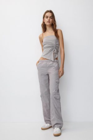 La colección de Pull&Bear es un festín para los amantes de la moda, ofreciendo opciones para todos los gustos y ocasiones. Los pantalones jogger de color azul marino, con su elástico fuerte en la cintura y patrón fluido que se recoge en los tobillos, son perfectos para un estilismo actual y rejuvenecedor. La combinación con crop tops de colores vibrantes añade un toque de frescura a este look versátil.