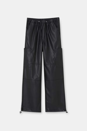 Para aquellas que buscan un estilo más audaz, los pantalones jogger de tejido efecto piel, con su goma elástica en la parte trasera de la cinturilla y ojales metálicos decorativos, son una elección atrevida y moderna. Combinados con un jersey ajustado y un bolso con tachuelas, estos pantalones se convierten en la pieza clave de un conjunto rebelde y chic.