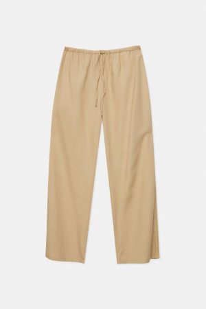 - -Opta por unos pantalones de tejido rústico en tono crema con cintura elástica.