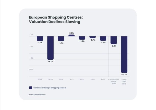 Los arrendadores de locales comerciales en Europa se han enfrentado a mayores pérdidas de valoración de los inmuebles que la mayoría de los demás segmentos. Desde la primera mitad de 2022, las valoraciones de los centros comerciales ‘prime’ en la Europa continental han disminuido solo alrededor del -3%, mientras que han caído alrededor del -15% desde 2018 y ahora ofrecen rendimientos iniciales netos de alrededor del 5,5% a partir del primer semestre de 2023.