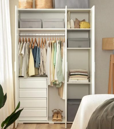 ¿Por qué limitarse a colocar el armario solo en dormitorios? Con su diseño estilizado, este mueble puede integrarse de manera sorprendente en tu vestíbulo o pasillo. Utiliza el espacio vertical para aprovechar al máximo las puertas abatibles y guarda abrigos, bufandas y otros accesorios, manteniendo un aspecto limpio y organizado.