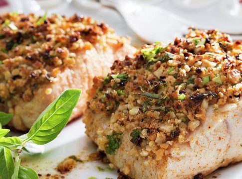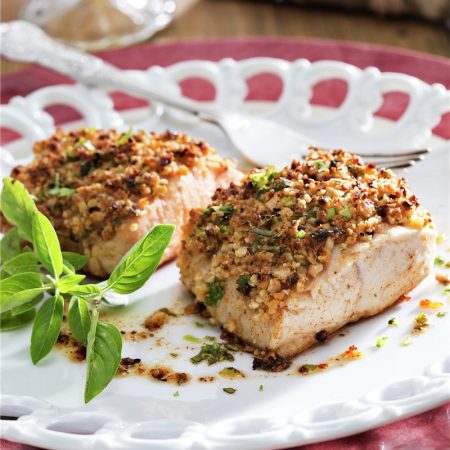 - Incorpora queso rallado a la mezcla de frutos secos y pan rallado para una costra indulgente y cremosa.