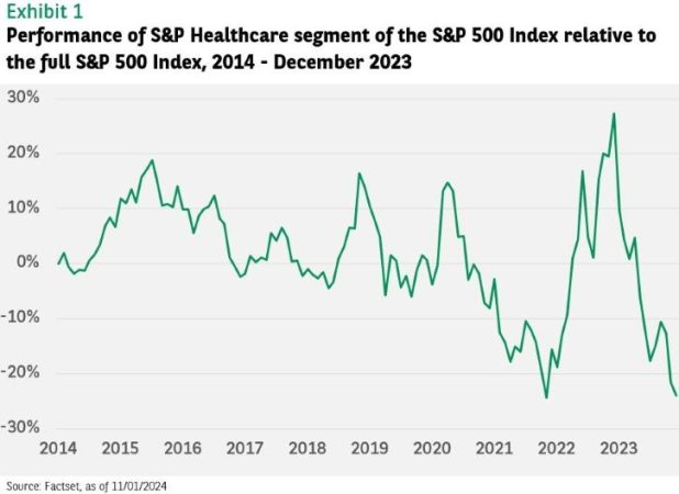 Al entrar en 2024, el sector sanitario cotiza más o menos en línea con su rango de valoración histórico, aunque en el extremo inferior de su rango a 10 años en relación con el mercado en general, tal y como se aprecia en el gráfico inferior (Subíndice sanitario del S&P en relación con el S&P 500).