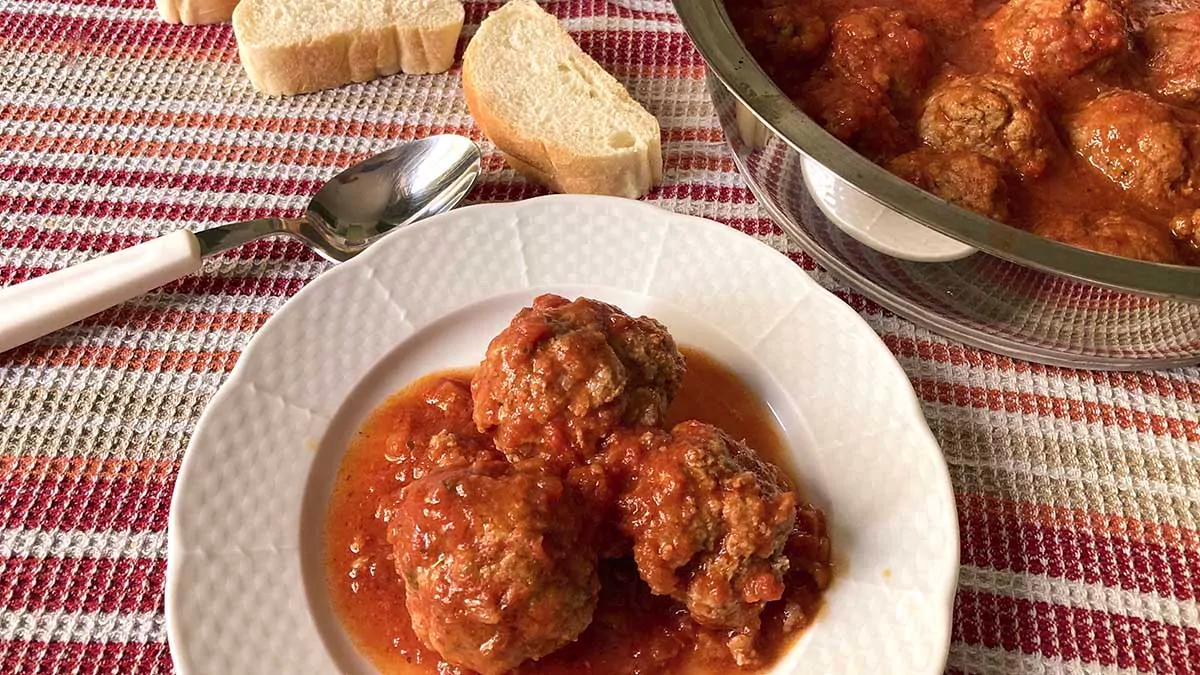 Añadimos el agua, el vino, la sal y la pimienta al vaso y programamos 30 minutos a temperatura Varoma, velocidad cuchara. Colocamos el Varoma con las albóndigas en su posición. Al finalizar el tiempo, verificamos que las albóndigas estén bien cocidas, las retiramos y trituramos la salsa durante 10 segundos a velocidad 8. Colocamos las albóndigas en una fuente y las cubrimos con la salsa resultante.