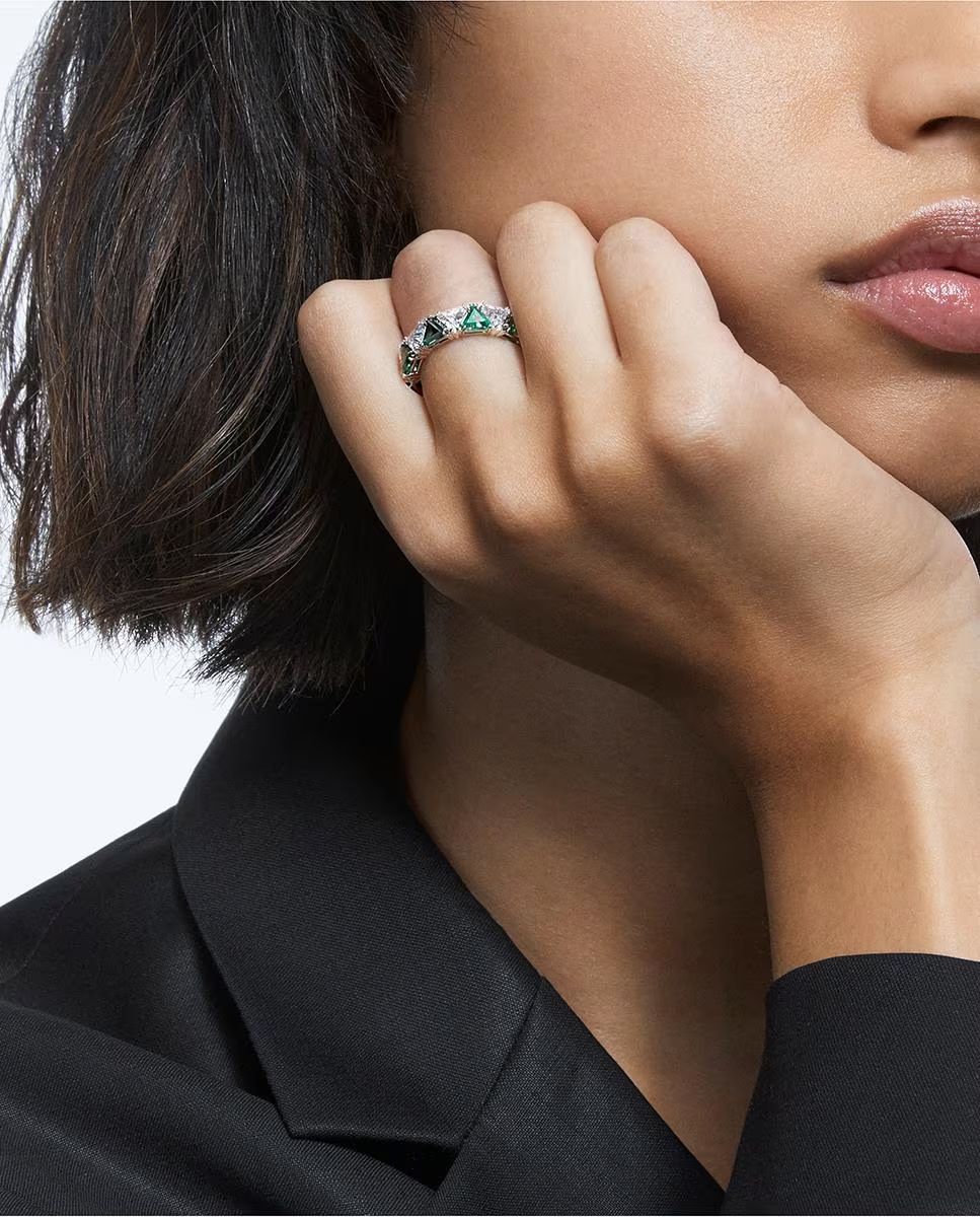 Sumérgete en el resplandor de la elegancia con el anillo Swarovski Milenia, una obra maestra de cristales de talla triangular y baño de rodio. Este exclusivo anillo de cóctel deslumbra con su diseño único, donde piedras transparentes y verdes se entrelazan en un efecto prismático deslumbrante. Diseñado por la visionaria directora creativa Giovanna Engelbert para la Collection I, este anillo Millenia es una declaración de estilo moderno y sofisticación.