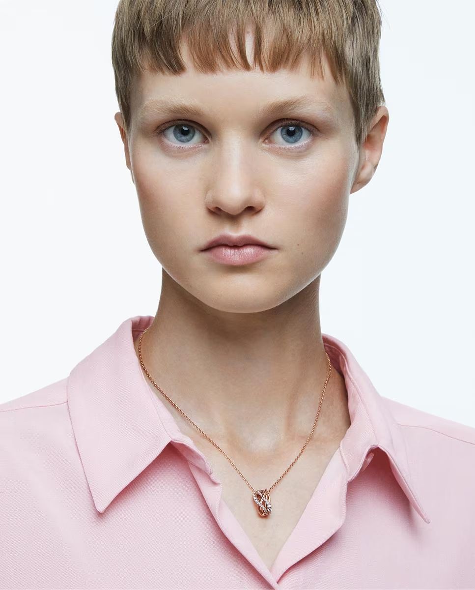 Haz una declaración de estilo con el collar Twist con pedrería, una pieza elegante y atemporal que elevará tu look diario a nuevas alturas. Con líneas sutilmente curvas de metal pulido con baño en tono oro rosa e hileras de piedras blancas que deslumbran con su brillo, este colgante irradia una luz increíblemente brillante. Completado con una cadena a juego y cierre de mosquetón, este collar es la adición perfecta a tu colección de accesorios.
