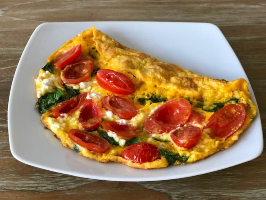 Con una espumadera, pasa la cebolla, calabacín y tomate a un plato con papel absorbente para eliminar el exceso de aceite. Una vez escurrido, añade al bol de los huevos y mezcla. Sazona al gusto. Vierte la mezcla en la misma sartén donde se cocinaron las verduras. Deja que cuaje por un lado, dale la vuelta y cocina por el otro lado. Sirve la tortilla acompañada de los tomates cherry. ¡Listo para disfrutar!