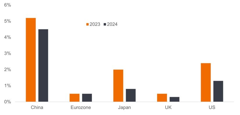 Source: Bloomberg, consensus economic forecasts, year-on-year change in real (inflation adjusted) gross domestic product. Figures as at 15 January 2024. There is no guarantee that past trends will continue, or forecasts will be realised.