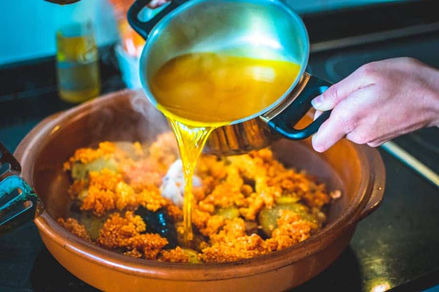 Antes de incorporar el caldo, ajustamos la sal según el gusto. Algunos añaden azafrán o colorante para darle color. Distribuimos las rodajas de patata, colocamos una cabeza de ajo en el centro y agregamos medio tomate partido por la mitad. También es común rehogar el tomate con un poco de pimentón o tomate frito, según las preferencias.