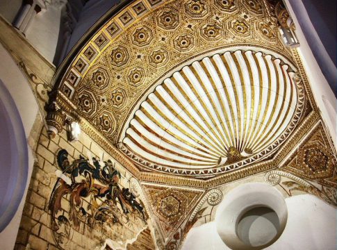 Al entrar en el interior de Santa María la Blanca, uno se encuentra con una característica sorprendente: el techo de madera tallada, conocido como artesonado mudéjar. Este techo, que parece un intrincado encaje de madera, es una obra maestra de la carpintería mudéjar. Cada detalle del artesonado es único y refleja la habilidad de los artesanos medievales que lo crearon. A medida que la luz del sol se filtra a través de las ventanas, las sombras y los reflejos en el techo crean un efecto hipnotizante, como si estuviéramos mirando al cielo estrellado de la noche. Este techo es un ejemplo sobresaliente de la creatividad y destreza de los artesanos mudéjares en la Edad Media.