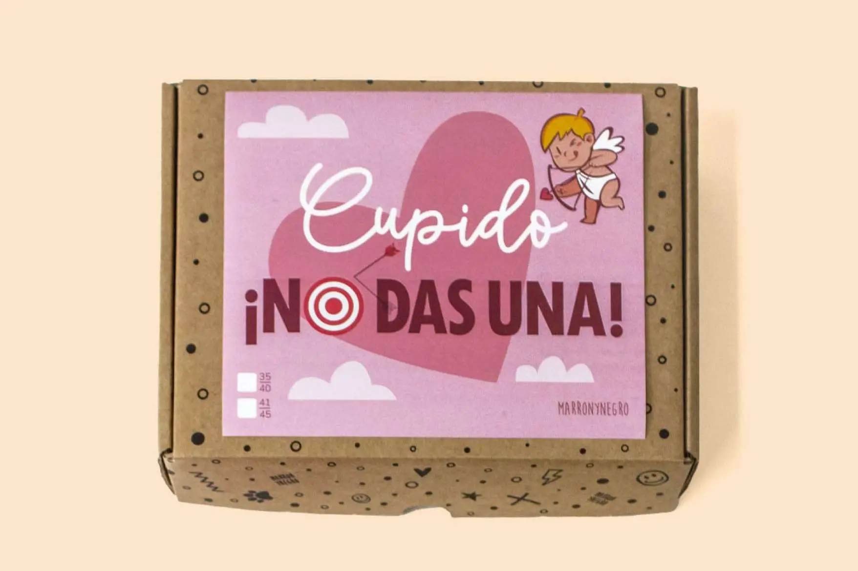 El pack “Anti San Valentín” de Marronynegro es una cajita que contiene varios productos hechos en España, los cuales están cargados de diseños originales y buenrolleros. Por un lado, es posible encontrar unos calcetines en tonos azules y verdes fabricados con un 80 % de algodón. Además, es importante señalar que estos cuentan con el lema de la campaña “Cupido, no das una” bordado y que están disponibles en dos tallajes: 35/40 y 41/45.