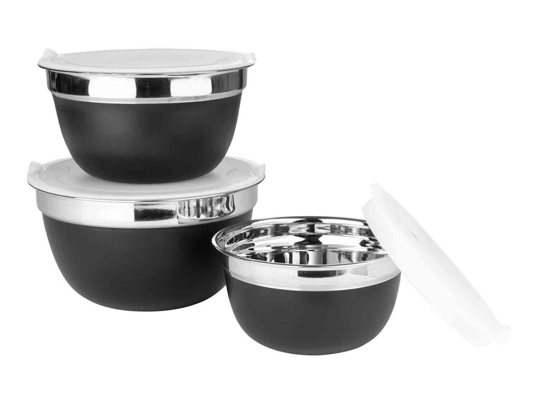 Coloca las palomitas recién hechas en este set de cuencos de acero inoxidable, perfectos para servir, preparar, guardar y congelar. Con tapas de plástico, estos cuencos pueden guardarse unos dentro de otros para ahorrar espacio.