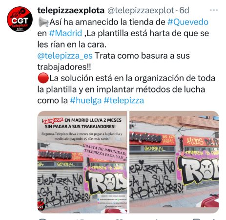 Sin embargo, fuentes del sindicato de CGT Telepizza se muestran enfadados y en búsqueda de soluciones. «Para empezar, nos parece increíble la impunidad con la que viven estas empresas y que la legislación laboral se lo permite. Los trabajadores dependen enteramente de sus salarios para vivir. La empresa supuestamente va diciendo que está en pérdidas. Pero no solo no ha declarado algo así a los trabajadores públicamente, sino que ni siquiera ha justificado unas supuestas perdidas con documentos oficiales».