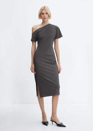 Si buscas un look elegante y moderno, el vestido midi con escote asimétrico en color gris es la elección perfecta. Con un diseño drapeado que crea líneas favorecedoras, este vestido es ideal para lucir en la oficina o en una cita especial.
