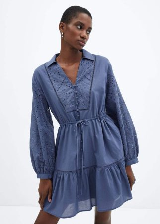 Para aquellas que buscan un toque de sofisticación, Mango presenta un vestido con detalles bordados en tono azul. Este diseño ajustado a la cintura y de estilo camisero es ideal para lucir un look femenino y delicado, perfecto para diversas ocasiones.