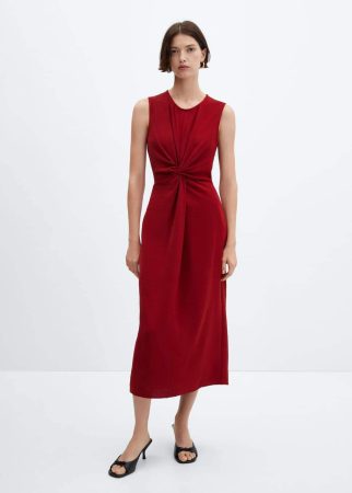 El color rojo siempre es un acierto, y Mango lo combina con un detalle de nudo en la cintura para crear un vestido elegante y favorecedor. Con longitud midi y sin mangas, este vestido es perfecto para lucir en eventos especiales o simplemente para dar un toque de color a tu día a día.