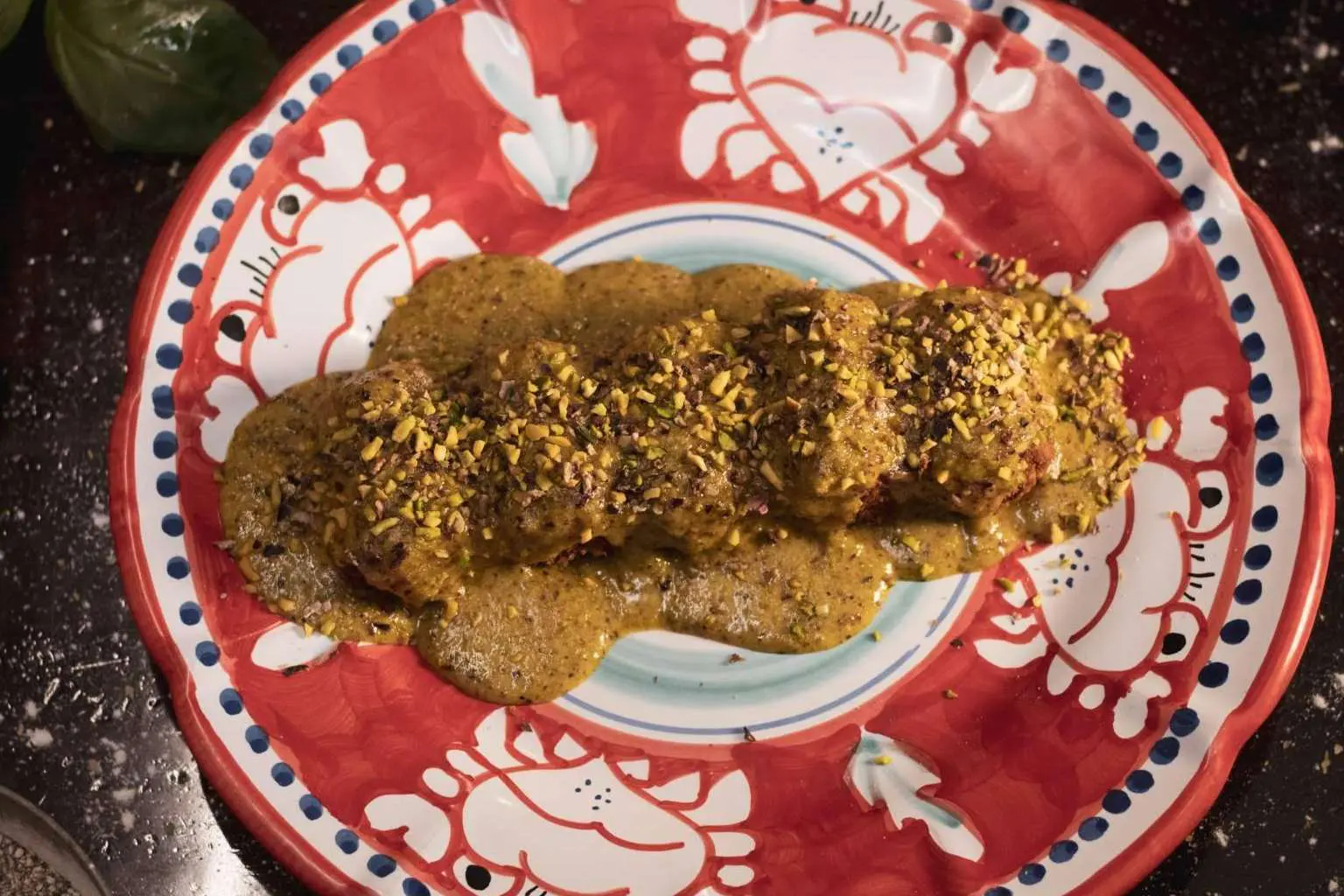 Este restaurante también dispone en su menú de un plato de liguina, gamberi e pistacchio. Se trata de una combinación de pasta linguina, similar al espagueti aunque más ancha, con gambas, pistacho picado y una crema que también es infusionada con este fruto seco.